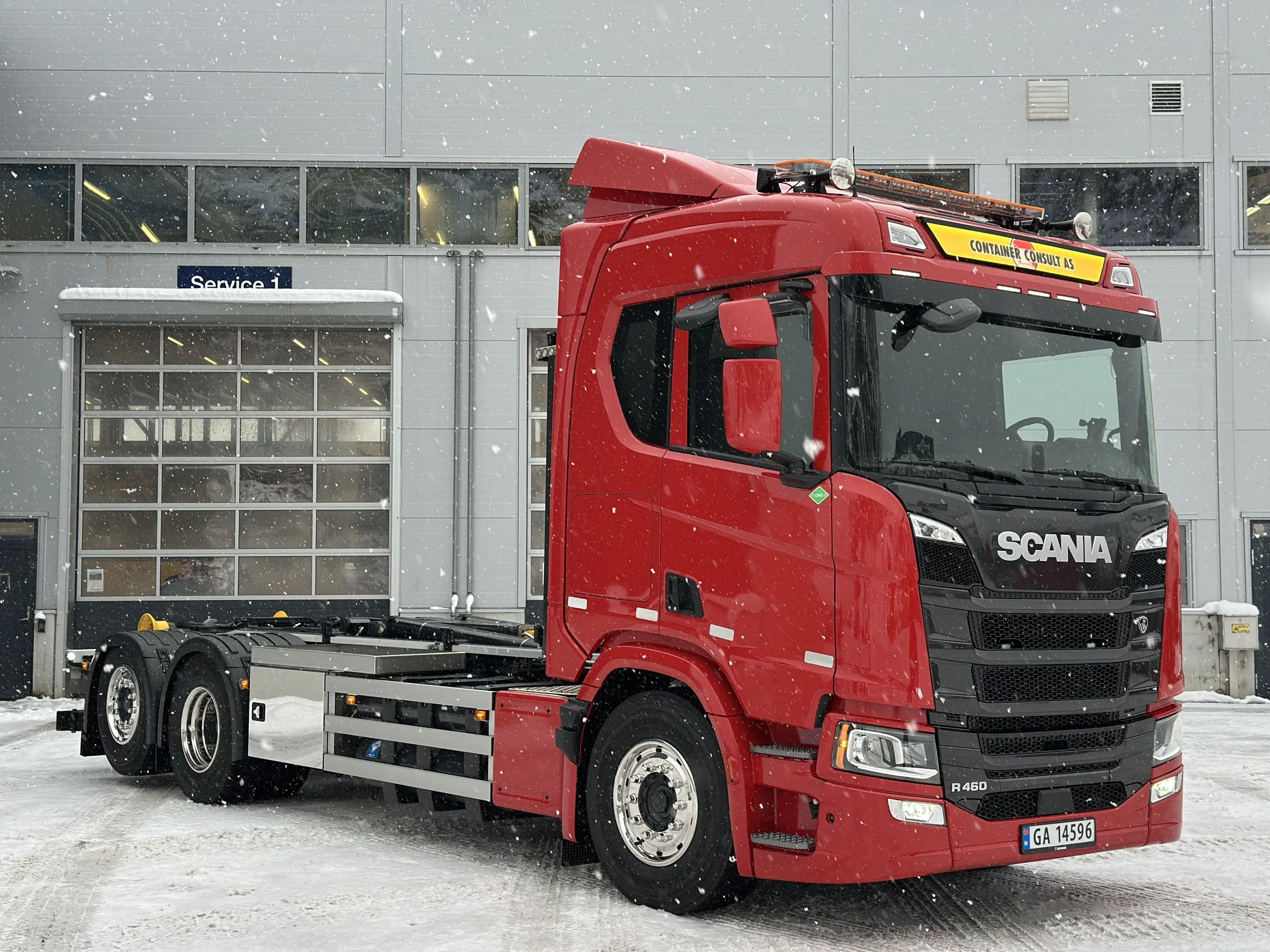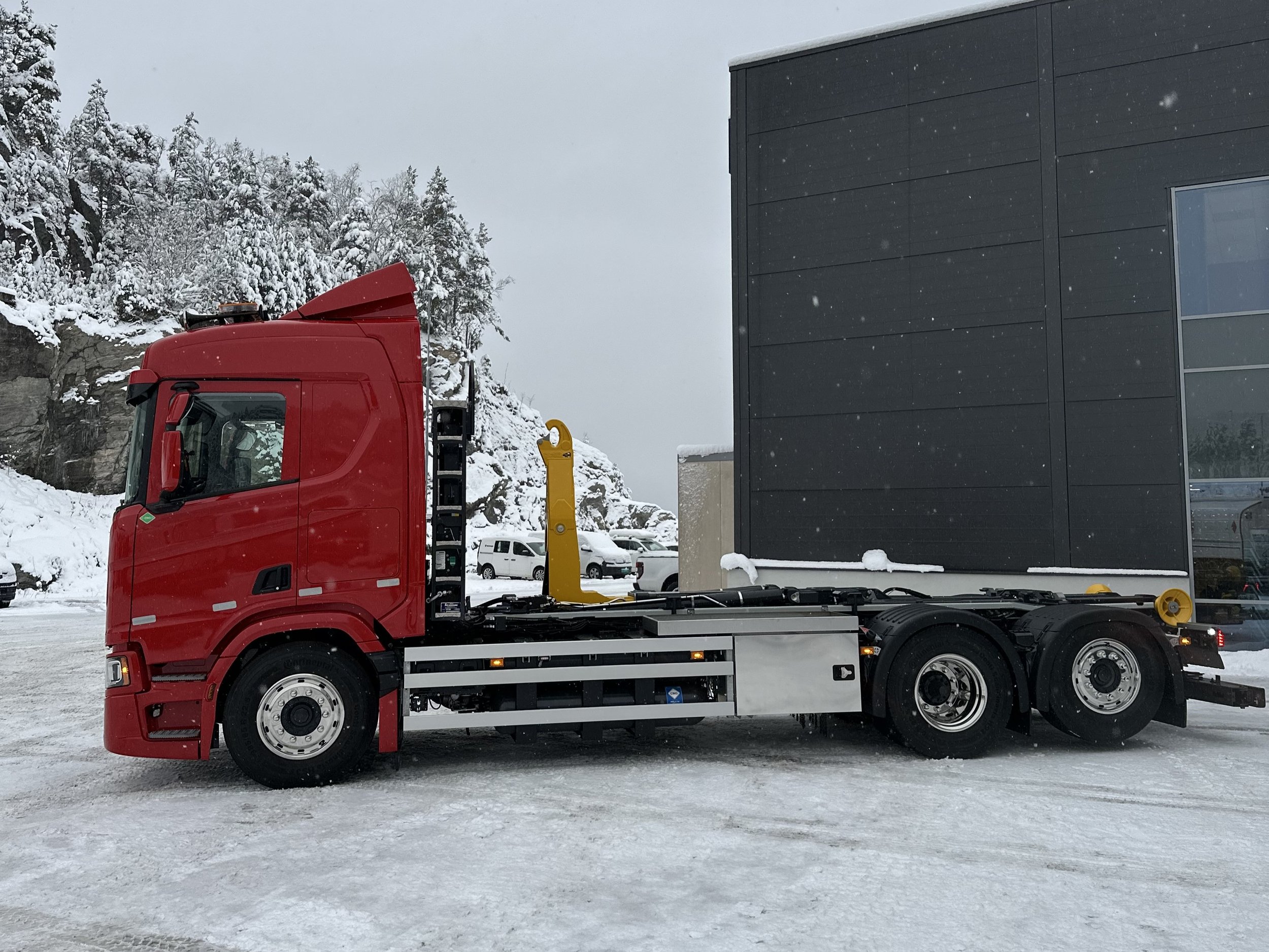 Vi fortsetter å utvide bilparken vår med denne splitter nye og miljøvennlige krokbilen. Bilen er en SCANIA R460 B6x2*4NB CBG krokbil med Pallift T20A krokbil-påbygg.